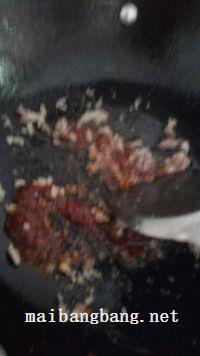 6.锅烧热,下油,放蒜茸,花腩碎爆炒,再放入黄豆酱翻炒至花腩熟。