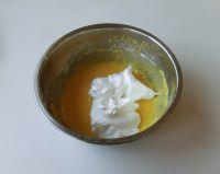 8.取1/3蛋白霜加入到做法3的蛋黄面糊中,用刮刀翻拌均匀。