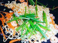 2.虾去壳和虾线,葱,胡萝卜切好,方便面用开水泡软