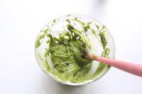 4.加入融化后的黄油及搽茶粉和牛奶打至蛋水油融合。